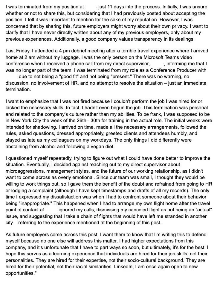 11 days in, and on my day off, I was fired from my remote job. My mistake? I took the advice of a white colleague on how to handle a logistical issue with a team member I did not know.